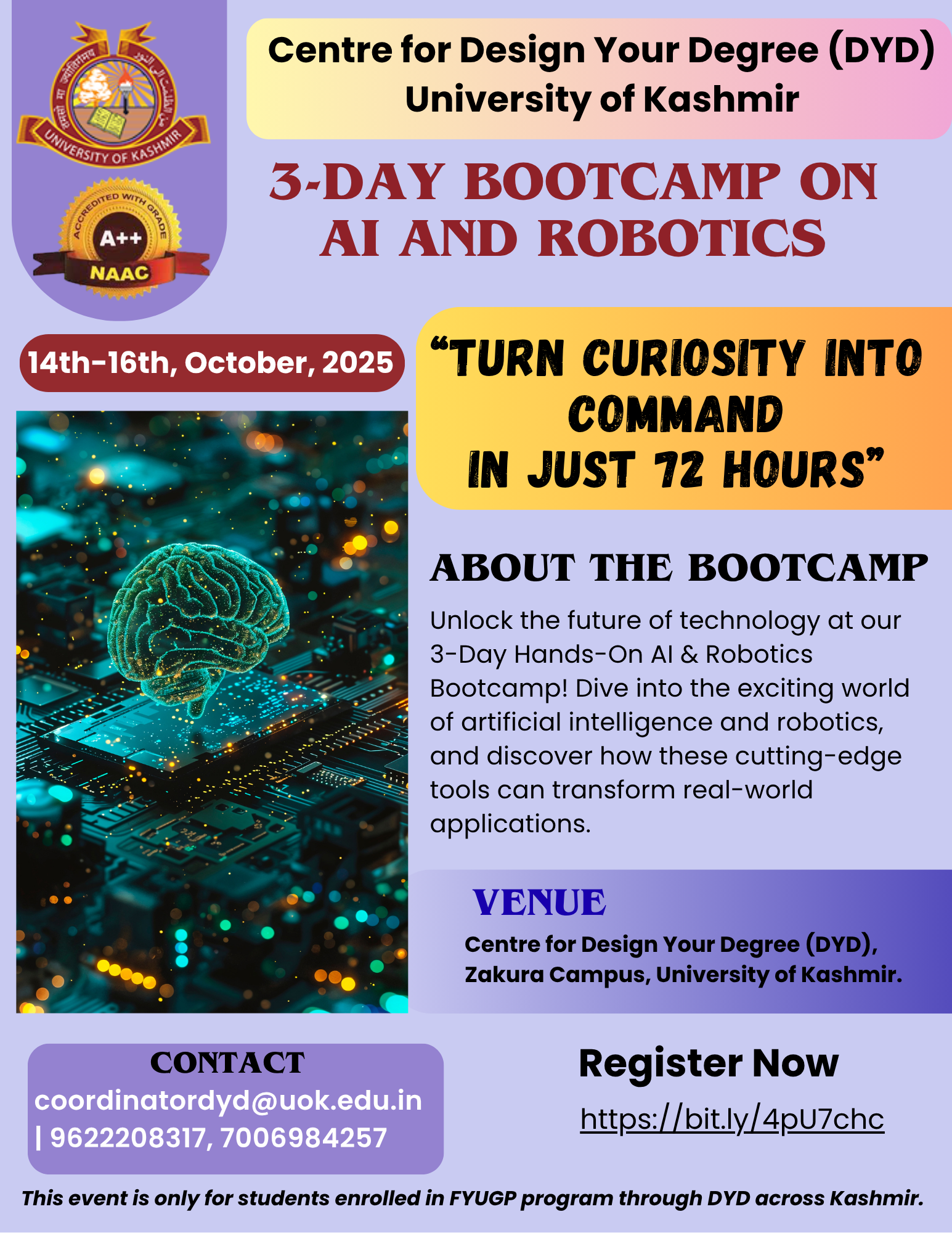 Designing Futures, Building Pathways : 3-Day Bootcamp On AI and Robotics 14th-16th, October, 2025 Held on: 14 Oct 2025 Unlock the future of technology at our 3-Day Hands-On AI & Robotics Bootcamp! Dive into the exciting world of artificial intelligence and robotics, and discover how these cutting-edge tools can transform real-world applications.